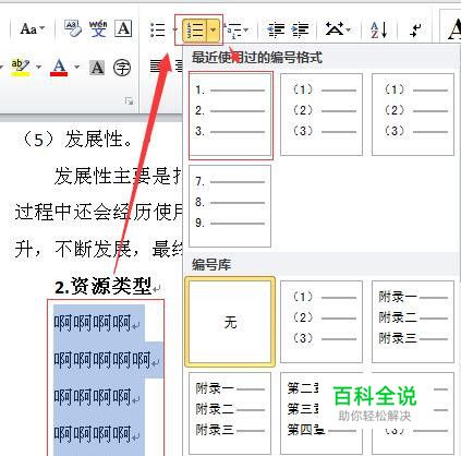 选中需要添加编号的文本段落,选择“段落”区域的编号图标,再选择自己需要的编号方式,过程如图。结果会出现如二图所示的,编号与文本之间的距离很大的现象。