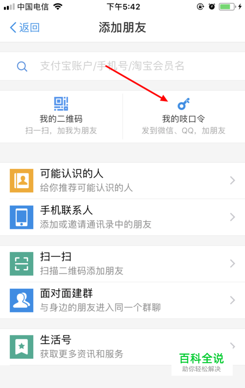 点击“去生成吱口令”后,会转到“添加朋友”的界面。然后,点下图红色剪头所指的“我的吱口令”。