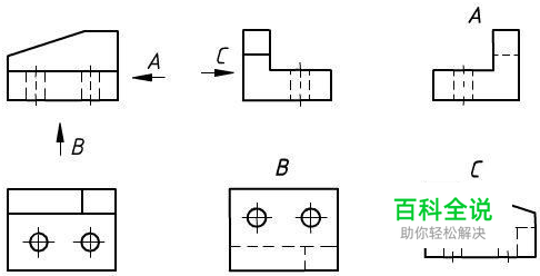 局部视图。 局部视图是将机件的某一部分向基本投影面投射所得的视图,主要用于表达机件的局部外形。局部视图的画法、标注应注意以下两点: 局部视图只画机件的某一部分时,其断裂边界用波浪线或双折线表示,如视图 A所示。当所表示的局部结构是完整的且其外轮廓又是封闭的,则波浪线可省略,如视图 B所示。 局部视图通常按向视图的配置形式配置并标注;当局部视图按基本投影关系投影,与相应视图之间没有其他图形隔开时,可省略标注。