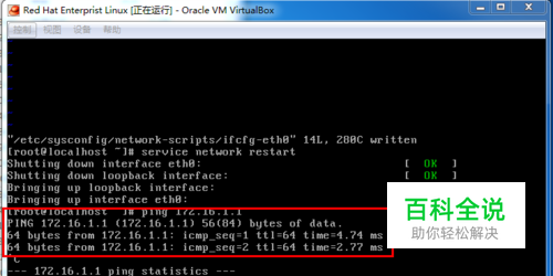 重启一次网络服务,使用#service network restart重启,然后Ping网关看是否可以正常通讯: