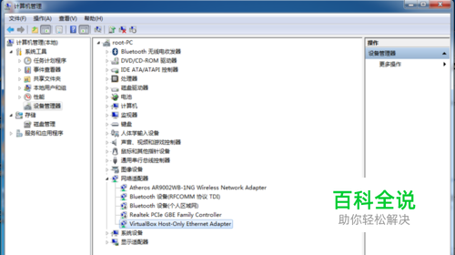 在设备管理器右边的窗格找到“网络适配器”点开,里面会罗列出计算机上所安装的所有网卡,其中包括了Virtualbox虚拟出来的网卡,鼠标右键“Virtualbox Host-Only Network”这块网卡,在弹出的菜单中点击“卸载”,会弹出一个警告窗口,选中“删除此设备的驱动程序软件”我们连虚拟网卡的驱动也一并删除,“确定”后删除: