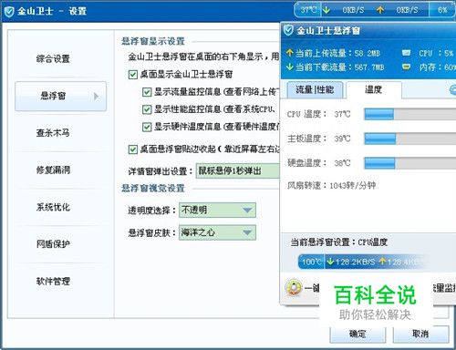 如果你电脑上装的是金山卫士杀毒软件,那么打开金山卫士的“设置”,进入悬浮窗口标签,勾选“显示硬件温度情况”即可,当你的电脑硬件温度超过正常温度,悬浮窗口电脑硬件温度会变红色颜色。