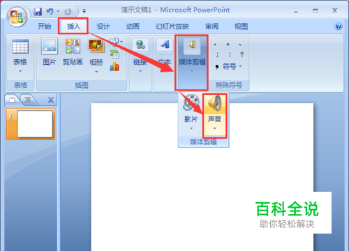 首先打开PPT软件,现在在一个空白的文档里给大家做演示,点击【插入】选择【媒体剪辑】下面的【声音】按钮打开。