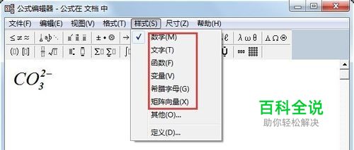 样式编辑 使用 公式编辑器编辑完公式后,我们可以在 公式编辑器窗口的 样式菜单中选择我们想要的字体, 样式菜单栏中一共为我们提供了数学、文字、函数、变量、希腊字母、矩阵向量六种基本内置样式,其中数字为默认样式。