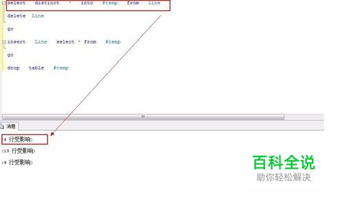 附上完整的SQL语句,复制后更改表名可直接使用。 select distinct * into #temp from Line delete Line go insert Line select * from #temp go drop table #temp
