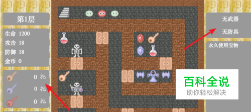 在第三层,我们可以先拿到几把钥匙,虽然有人把守,我们也没有武器,但我们可以硬闯过去,硬闯的代价就是消耗一点血量。但里面有几个药水,可以让我们恢复很多的血量。拿完东西后,继续到楼梯,上一层。