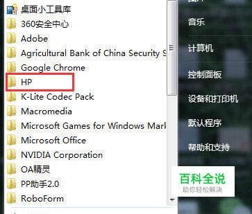 点击开始,选择所有程序,然后选择hp文件夹,如下图所示