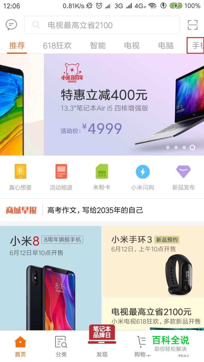 首先,打开小米商城应用APP,打开应用之后,点击页面顶部“手机”选项卡,进入小米商城手机页面。