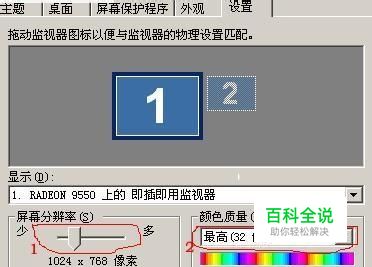 如上图,切换到“设置”选项卡,红线圈住的1位置,使用鼠标拖动滑杆即可修改分辨率; 如果想修改刷新频率,请点击红线圈住的3位置的“高级”按钮,弹出如下图的对话框!