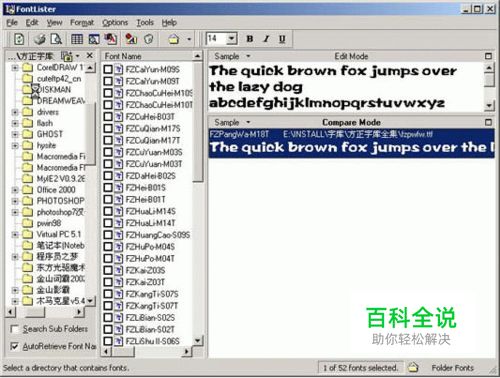 接了电话后,高手立马在十分钟后赶了来,他又用我刚才用过的方法试了试,还是不行。就问我:“有没有试过用字体安装软件装过?”“没有,我还不知道有这种软件呢。”哎呀,我怎么就没想到用软件来安装呢?高手不愧称之为高手。高手就从网上找了个字体安装软件---- FontLister V3.4.9,大小950KB,软件界面如图) ,这是一个英文的字体安装管理工具,很好用。用这个软件将字体安装后,嘿,问题就解决了。不过问题是解决了,但却让我又损失了一顿饭钱,那个心痛呀。