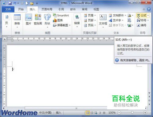 第1步,打开Word2010文档窗口,切换到“插入”功能区。在“符号”分组中单击“公式”按钮(非“公式”下拉三角按钮),如图2011072201所示。 图2011072201 单击“公式”按钮
