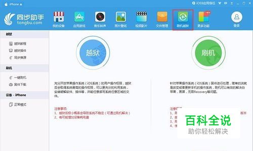 运行同步助手,点击【刷机越狱】,进入刷机界面