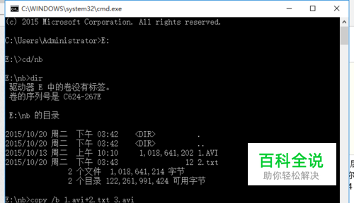 继续输入“copy /b 1.avi+2.txt 3.avi”后按enter(ps:不包括引号)。这段命令中:1是你要上传的的视频名称,avi是你的视频的格式,我这里是avi,如果是mp4格式则把命令中所有avi替换成mp4,2便是新建TXT文档的名称。按下enter之后会弹出如图一所示,这时请等待30秒左右(取决于你的视频大小,1G的视频约30秒),会弹出如图二