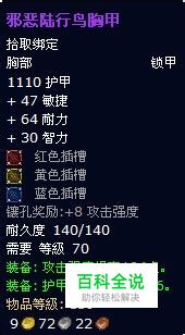 胸甲 邪恶陆行鸟胸甲(太阳之井高地5号穆鲁) +47 敏捷 +64 耐力 +30 智力 红色插槽 黄色插槽 蓝色插槽 插槽加成: +8 攻击强度 装备: 攻击强度提高104点。 装备: 护甲穿透等级提高26