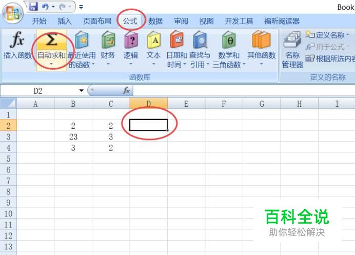 之后我们点击图示中单元格,然后点击公式,点击自动求和;