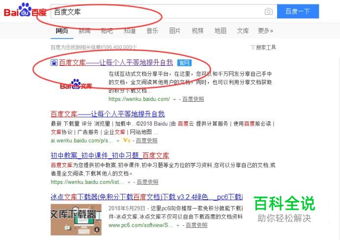 百度文档 在浏览器中搜索“百度文库”,然后在下方找到具有官网标志的链接,如下图所示: