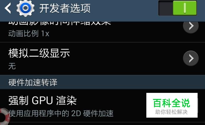接着在现实的选项中找到“强制GPU渲染”,在右边的小框内点一下,使之勾选。然后重启一下手机就可以使CPU不必进行2D图形渲染,减轻了它的负荷,从而可以更流畅地运行游戏。