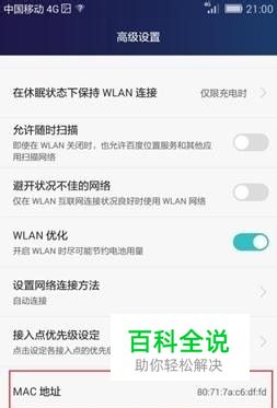 路由器设置了MAC地址过滤/或者MAC地址过滤策略选择错了: 广大的花粉像我一样,平时还是蛮注意安全保密的,一般都会在路由器上设置一个MAC地址过滤,防止不法份子用非法软件蹭网。如果WIFI一直显示“已保存”,我们就要看一下,我们输入的MAC地址是否正确,MAC地址可以在WIFI高级设置中查看;还有我们的过滤规则需要选择正确哦,如果选择“禁止”,此时我的这个手机就肯定连接不上了。 手机WIFI MAC地址查看: