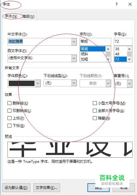 选中毕业设计封面文字,如图所示。点击"开始→字体"右侧向下箭头,选择"字体"标签设置中文字体、字型、字号和字体颜色等。