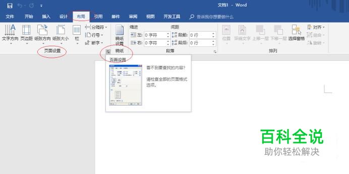 启动Word 2016文字处理应用程序,如图所示。选择"布局→页面设置"功能区,点击右侧向下箭头。