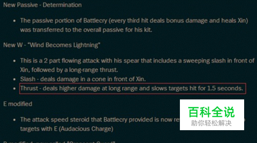 -新的被动技能 【Determination(决心)!】 W技能的被动“第三下普攻造成暴击并回复生命值”的效果变为整体被动。 分析猜测:将第三次普攻暴击并回复生命值 融入到英雄被动上,在机制上并无变化。相应的,暴击伤害和生命值回复数值也由原先的“随W技能等级”提升变为“随人物等级”提升。这部分改动让追求持续输出 赵信的召唤师,把注意力能更多的放在主动技能上,更注重技能的搭配,而不是“一头猛冲,有死无生!”