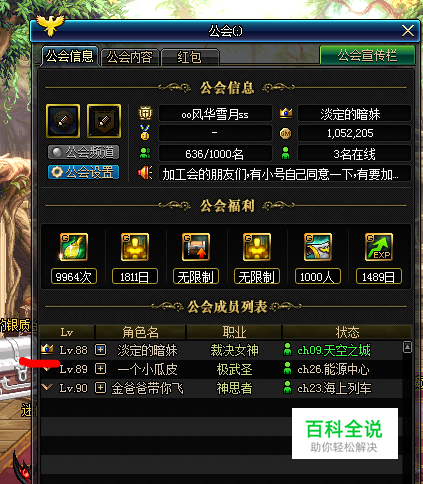 首先,我们得是公会的会长才可以操作。对于普通的成员,没有这样的权限。 我们先点击这个菜单这里有个工会,我们打开公会。