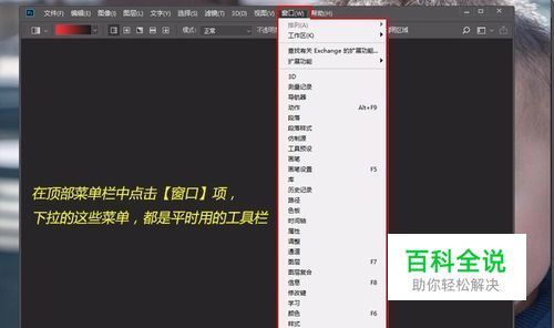 在顶部菜单栏中点击【窗口】项,下拉的这些菜单,都是平时用的工具栏