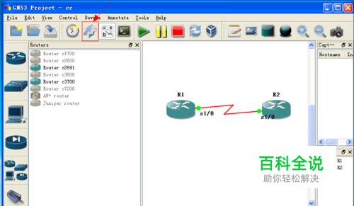 选中坐下角连线的工具,再点击R1,会出现R1的所有接口,选择其中一个接口,如s1/0,选中之后,会出现一条红色的线,再把这条线连接到R2的s1/0接口上。
