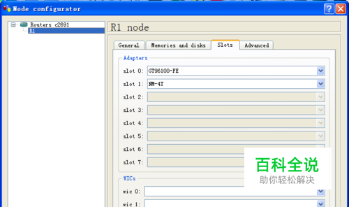 为路由器R1配置串行接口,先双击“路由器R1”,再选中“R1”,点击“Slots”,在“Slot 1”下选择“NM-4T”,最后点击“OK”.同样路由器2配置串行接口的方法与路由器R1的配置方法是一样的。
