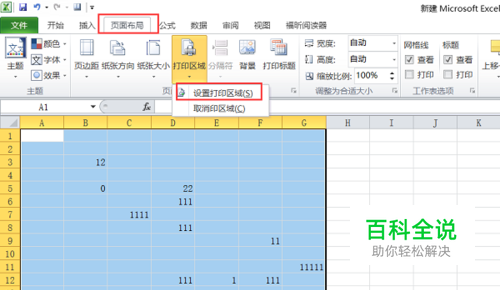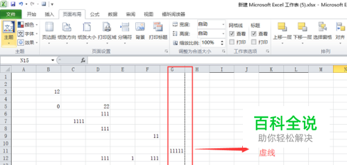 取消打印区域的虚线 虚线的产生:打开电子表格,在A1:G15的区域输入一些数据(可以随便输入),然后点击主菜单中的“页面布局”,接着选择A1:G15,在点击“打印区域”,设置打印区域,接着就会看到表格中出现了虚线。