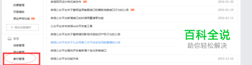 首先打开你的微信公众号后台,在左下方有个素材管理的选项,点击打开,跳转到发布文章的界面。