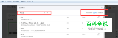 接着上一步点击添加音乐之后,会弹出这个小窗口,你可以输入歌手名字或者歌曲的名字,不过前提是在QQ音乐里面有的,已经收录的,比如有的歌曲版权QQ音乐这里没有的话你就添加不了。