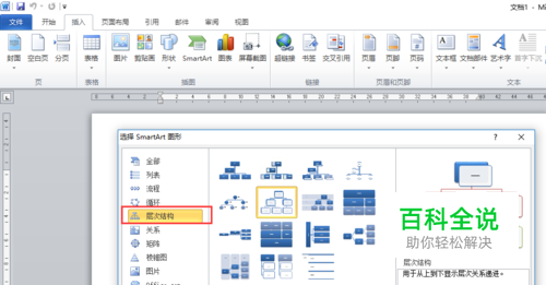 在“SmartArt图形”对话框中,选择“层次结构——层次结构——确定”。如下图所示: