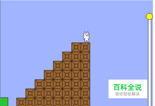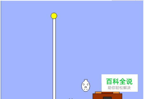 到达第一关最后高台这里,直接跳是过不去的,会有个杆怪碰到,就GG了,这个时候我们要做的是在高台上跳起来,这样就躲开了杆子,还没有完,要是直接走下去,还会被后面的小怪碰到也GG,所以,我们需要直接跳过旗杆,但注意不要把旗杆在屏幕里弄消失,躲开那个掉下来的怪,就过了第一关了。