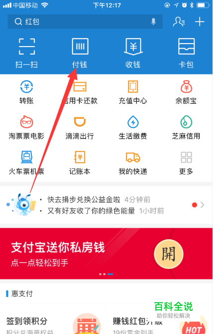 要想使用集分宝,必须点击首页的“付钱”。