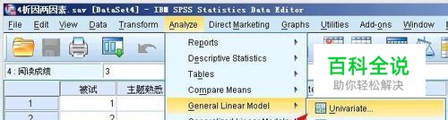 首先要打开主对话框,如图所示,在菜单栏上执行:analyse--GLM--univariate