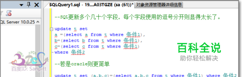 若是oracle更新多个字段很简单,见下图,若是SQL更新多个字段的值却不能使用的这样的语句,只能多个字段以逗号的分开,要更新多少个字段就得写多少个,当然这种方法是最直接的笨办法。