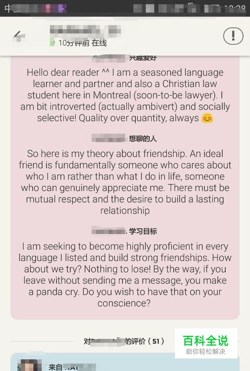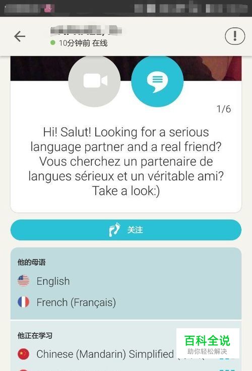 返回主界面,查看对方资料(对方自我介绍、兴趣爱好、所属国别、想要聊天的对象要求),确定是否符合自身语伴要求。