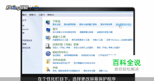在左侧边栏打开“外观和个性化”,在个性化栏目下选择“更改屏幕保护程序”。