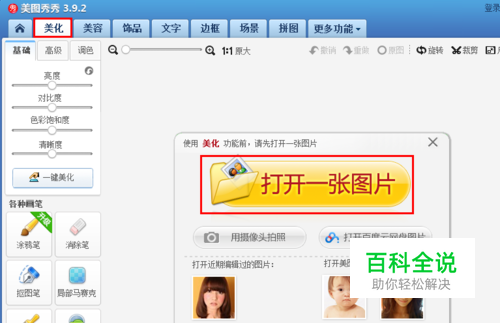 打开“美图秀秀”,切换至“美化”选项卡,然后点击“打开一张图片”按钮。