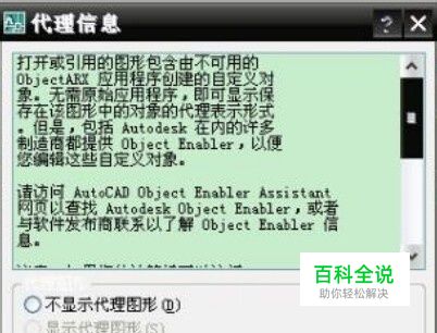 有的时候,我们收到一些Dwg文件,打开时,会出现如图的对话框,大致是关于“显示代理图形“,怎么样关闭“显示信息”窗口呢?