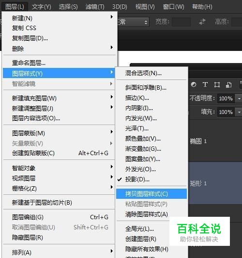 选中带有图层样式的图层,点击图层菜单>图层样式>拷贝图层样式