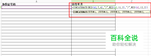 在需要显示出身年月日的单元格中输入公式=CONCATENATE(MID(a2,7,4),"/",MID(a2,11,2),"/",MID(a2,13,2)),这里注意公式内的a2是表示从a2单元格中获取身份证号码并得出结果。