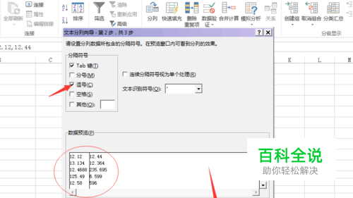 下一步之后,在这里我们需要选择的是“逗号”(若你的表格中用的是分号或者其他你可以自行选择),这是,下面预览栏会出现结果,如果没错直接点击下一步。