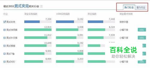 第二步:查询数据。 打开阿里指数后,在输入框输入要查询的关键字,这里以“男式夹克”为例,点击查询,出现下图界面。根据自己需求,选择左上角是“供货商”还是“采购商”。 此页属于 行业大盘页面,中间走势图分别是淘宝采购指数、1688采购指数、1688供应指数的走势图,需要看哪个选中哪个。页面往下拉,是“男式夹克”的相关行业,分热门行业和潜力行业