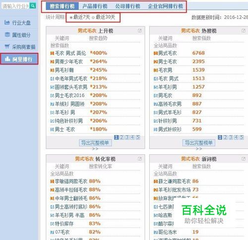 阿里排行页面 点击左侧阿里排行,进入排行榜页面,这是最重要的页面,也是信息量最多的页面。 点击 搜索排行榜,会有四个榜单,分别是:上升榜、热搜榜、转化率榜和新词榜,根据自己的商品选择最适合的词,才能达到最佳的效果。 点击 产品排行榜,有三个榜单,分别是:上升榜、热销榜和最新上榜,根据自己的需求进行采购。 此外还有公司排行榜和企业官网排行榜两个页面,在此不再一一介绍。