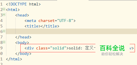 打开html开发工具,新建一个html代码页面,然后创建一个<div>标签,并给这个标签添加文字和一个class为了solid。 创建<div>代码:<div class="solid">solid: 定义一个边框</div>