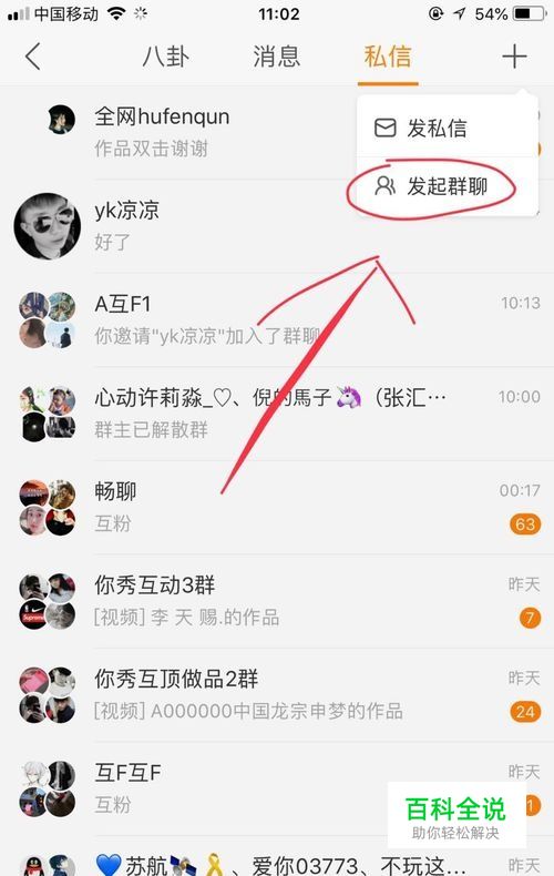 2、接下来在私信页面的右上角点击“+”选项,就可以点击“发起群聊”功能,添加好友创建群聊了