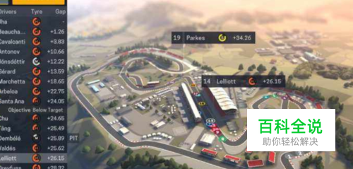 赛事界面名次:屏幕左侧显示当前赛事的排名,亦会显示出车手名字、车队(以颜色区分)以及轮胎类型/磨损程度。