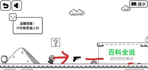 我们从红色横线处跳到问号方块前,用使用手枪键,就可以打到锯子。反复几次,锯子就会被打掉。